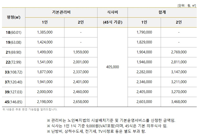 2인용으로 가장 작은 평수 21 평형 기준으로 입주시 보증금 4억원, 월200만원이라고 나와있으나, 식비가 45식 의무식(1인 40.5만원)으로 별도 부과되므로 기본 생활비는 합하여 월 약 281만원(2인식비 45식 포함)이라고 보면 되겠습니다. 월관리비에 각종 부대시설(수영장, 사우나 휘트니스 센터 영화관 등)서비스 제공합니다.