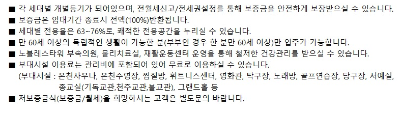 - 계약기간 : 분양 및 임대형 실버타운으로 계약기간 별도 확인 필요