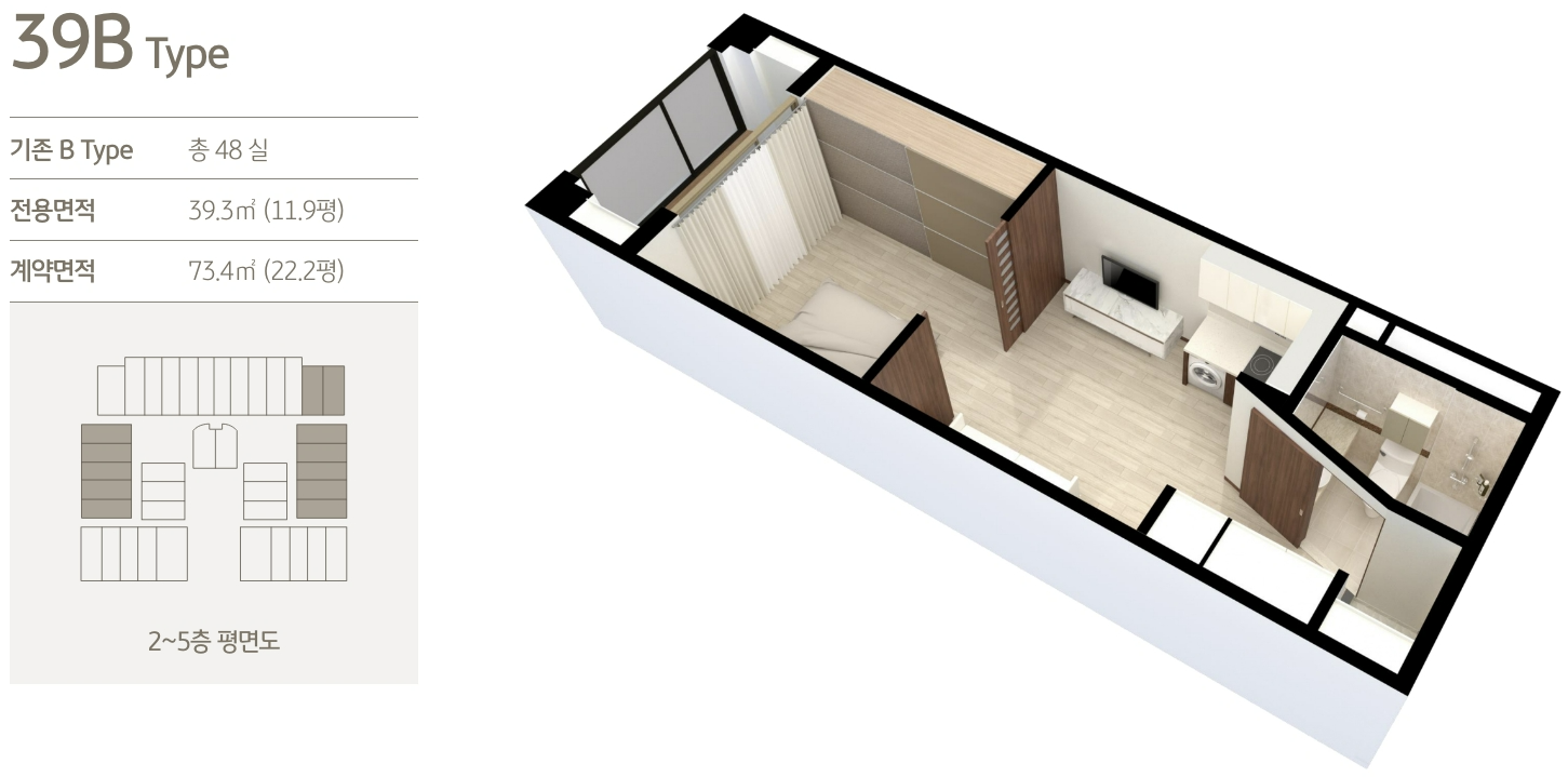 ※ 특별 프로모션 : 24년 9월~12월 계약자에 한해 의무 거주기간 적용 無 - 보증금 및 월세 기준 : 39 B type 전용면적 39.3㎡(약11.9평) 계약면적 73.4㎡(약 22.2평)기준(2인 기준)