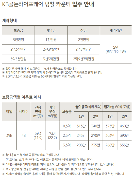 평창카운티의 경우 특이한 점으로 보증금에 따른 월세 변동을 들수 있겠습니다 그리고 164세대 중 보증금을 2.3/3.3억으로 높인 평수는 60세대 한정이고 나머지 100세대는 보증금은 3천만원만 받음으로서 보증금을 낮추고 월세를 많이 받는 임대형식을 취했습니다. 금액의 차이를 보면 2억이나 3억의 추가 보증금의 경우 3천만원과 대비하여 4.2% 수익율 비율로 추가금액을 부담하는 수준이어서 개인이 2억이나 3억으로 4.2% 이상의 수익을 얻을 수 있다면 굳이 보증금을 집어넣을 필요는 없어 보입니다. 물론 꾸준히 4.2%이상의 이자수익을 얻는 것이 쉽지는 않지만 마냥 어려운 수준의 금액도 아니어서 본 포스팅에서는 보증금 3천만원 기준으로 금액을 산정하겠습니다. 39B 타입으로 입주시는 보증금 0.3억원, 월460만원(식비포함, 부부기준)이 필요합니다. 식비는 1인 월 60식(60만원)입니다. 월생활비에 주1회 하우스키핑서비스, 이불세탁서비스, 피트니스, 스파, 부대시설 등이 포함되어 있으며 급탕비, 전기료, TV수신료, 상하수도비(?), 세대 소모품 교체비 등은 별도입니다.