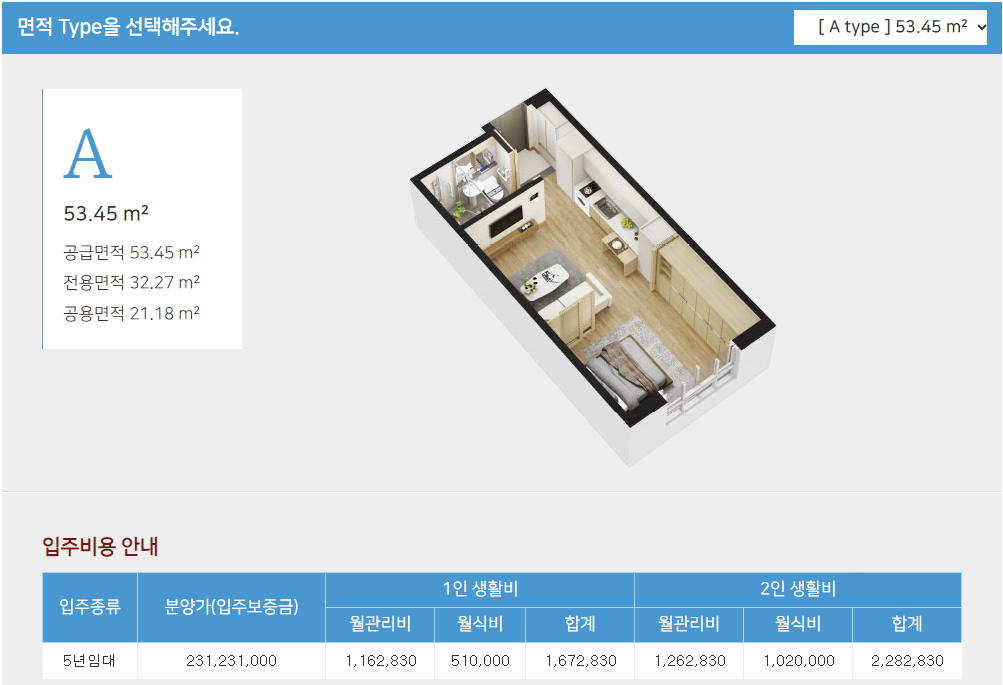 - 보증금 및 월세 : 시니어 타운 A 전용면적 32.27 ㎡ (약9.8평형) 공급면적 53.45㎡ 기준(2인 기준 최소평형)